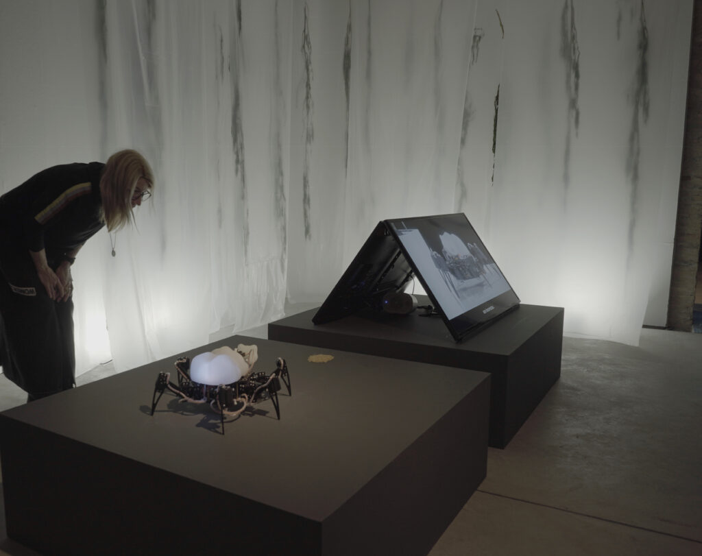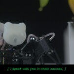 The robot ‘speaks’ in insect-based sounds, translated into subtitles in the video. The plants ‘response’ to the robot in its memory is via screen-based generative visuals, based metabolically on electrophysiologial plant recordings.