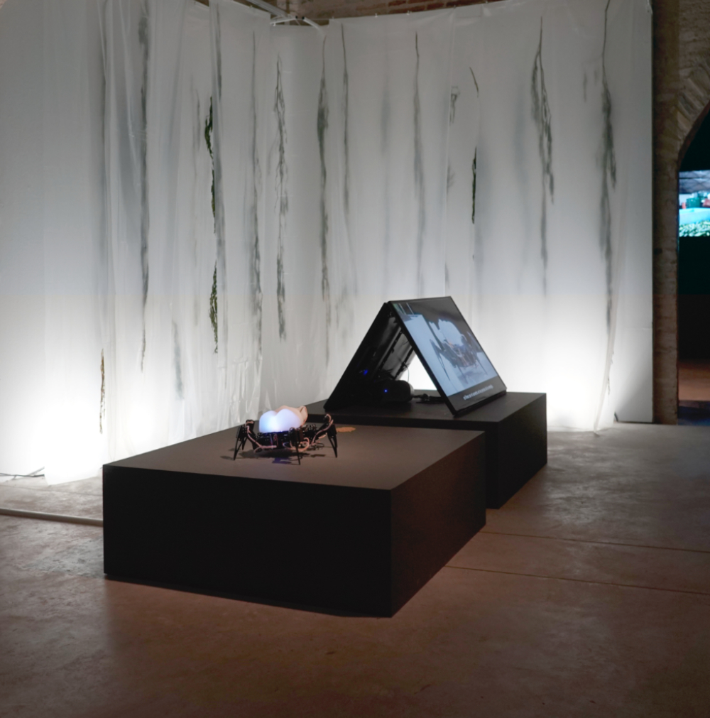 [On language]: The robot ‘speaks’ in insect-like sounds, translated into subtitles in the video. To create the robot’s insectoid speech, a neural network was loaded with the sounds of 50 insects (to which plants have been demonstrated to physically respond- bees, leafcutters, beetles, crickets). The neural network generated a series of emergent sounds in response to the narative text.